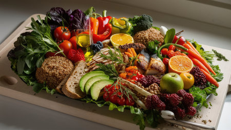 A visually appealing platter showcases a variety of fresh, healthy foods, including grilled fish, vegetables, fruits, and whole grains.