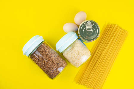 Food stock for quarantine isolation period on yellow background. Rice, egg, canned food, buckwheat, spaghetti. Food delivery, Donation. Copyspace