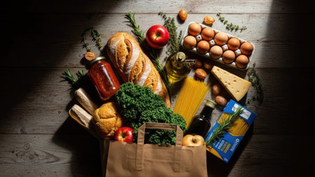 An overhead shot presents various food items, including bread, fruits, eggs, vegetables, and condiments. The composition utilizes natural lighting, emphasizing the textures and colors of the ingredients. This arrangement could be suitable for illustrating healthy eating, culinary concepts, or general lifestyle themes, and could be used for advertising or editorial content.
