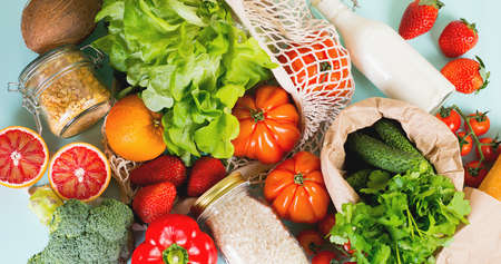 Healthy food background. Healthy vegan vegetarian food in paper bag vegetables and fruits on white, copy space, banner. Shopping food supermarket and clean vegan eating concept.