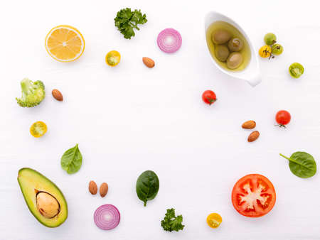 Food background and salad concept with raw ingredients flat lay on white wooden background.