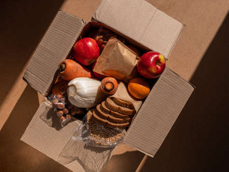 Healthy food delivery flat lay harsh shadows. Take away natural organic products package. Donation box New normal online shopping safe delivery concept. Fruits vegetables carrot apple grains bread nut