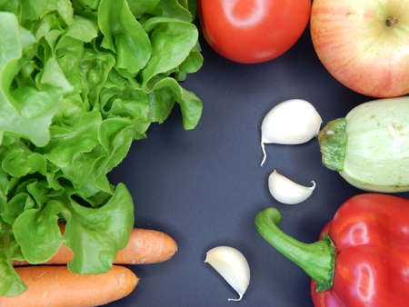Background from various fresh vegetables and fruits. Lettuce, carrots, bell peppers, zucchini, tomato, garlic, apple, pear, banana on a black background.