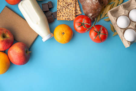 Vegetables, fruits, eggs, groceries on a blue background top view. Set of fresh products in an online shop with home delivery and a healthy variety of food. Copy space.