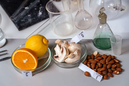 Oranges, mushrooms and nuts on a laboratory table with vitamin names. essential vitamins. food test laboratory.