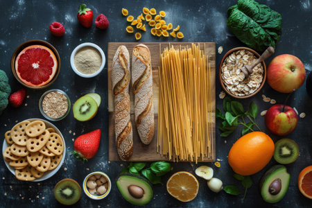 A vibrant arrangement of fresh foods on a dark background, including pasta, fruits, vegetables, and grains on a wooden board