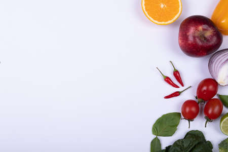 Overhead view of various healthy food on white background with copy space. unaltered, food, fitness and healthy eating concept.
