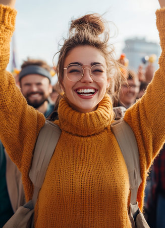 A joyful young woman celebrates, arms raised high, amidst a happy crowd. She's wearing a yellow sweater and glasses, her bright smile reflecting pure, carefree bliss.