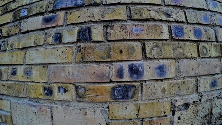 Close-up shot of a weathered brick wall, showcasing the texture and perspective of the aged construction. The details of the bricks are highlighted.