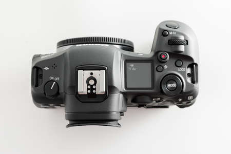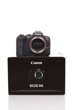 BRATISLAVA, SLOVAKIA - April 10, 2021: Canon EOS R6 Mirrorless full frame camera with original box isolated on white background.