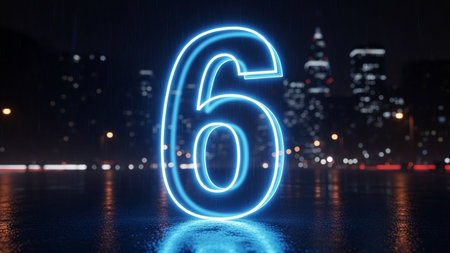 Number 6 neon glowing on wet asphalt night city background 3D rendering