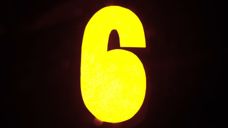 Sign template isolated on black background. Neon yellow symbol with the number six, luminous icon. Symbols for advertising projects or screensavers.