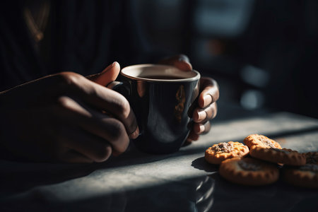 Black hand holding coffee cup. Drinking espresso coffee beverage in restaurant. Generate ai