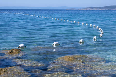 Float on shore of the sea. Bounding buoys at sea. Horizontal view. Copy space.