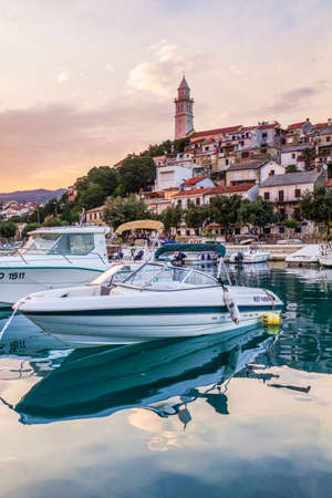 Novi Vinodolski, Croatia. July 26th 2018: Seafront view from marina on bell tower and old town