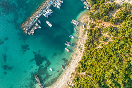 Aerial view of the beautiful coast of Skopelos island with thick pine tree forest, fine sandy beaches and emerald, turquoise sea, Sporades, Greece