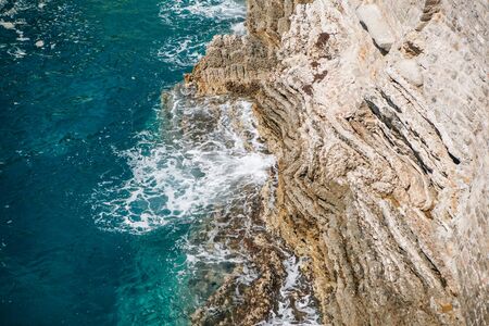 Dramatic marine background. Rocky coast of the Adriatic Sea. White foamy waves beat against the stone shore. Panorama of the sea coast. Aerial top view.