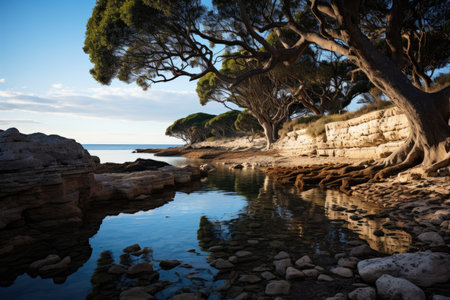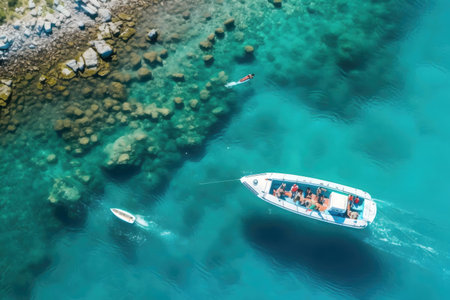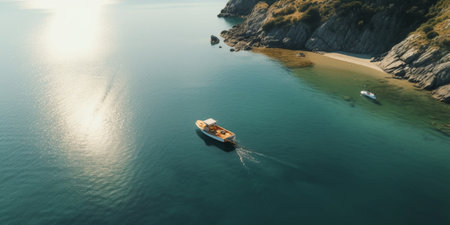 An overhead perspective capturing the expanse of a large body of water surrounded by land, An overhead capture of clear emerald sea with a rocky shore, AI Generated