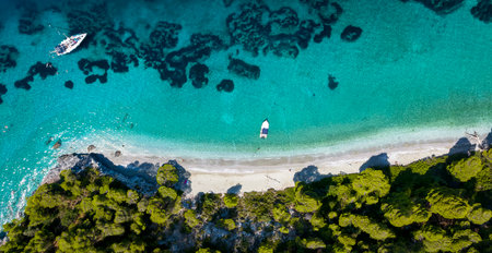 Seascape and sandy beach with turquoise clear waters and trees in Greece