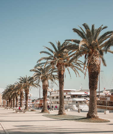 Amazing view of the city street on a sunny summer day with blue skies. Huge green palm trees growing on a cobbled street. Travel to Croatia. street view