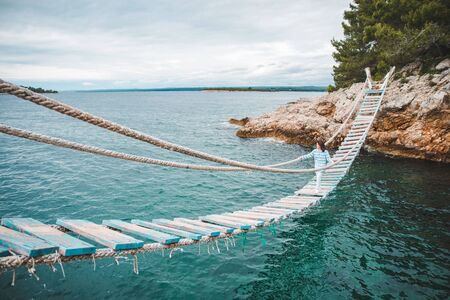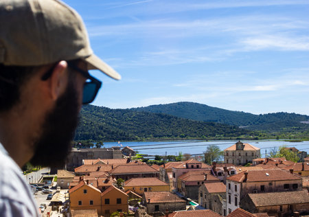 Young tourist observing scenery in Croatia. Relaxing summer tourism. Lifestyle