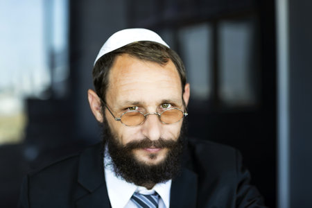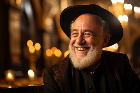 Portrait of a smiling Jewish priest rabbi inside a Jewish church