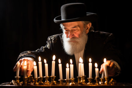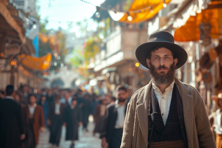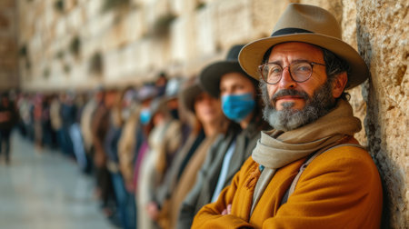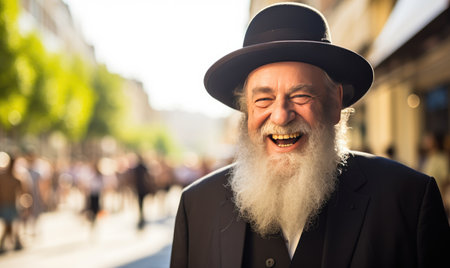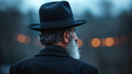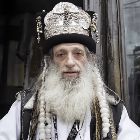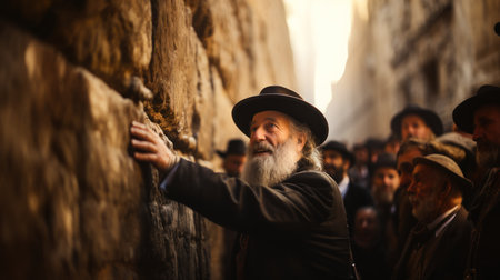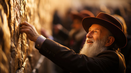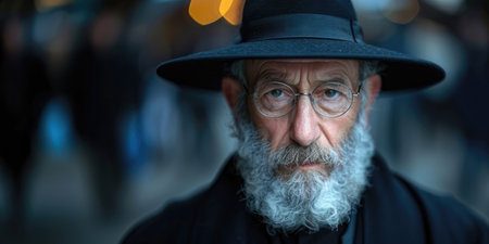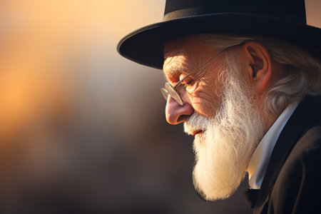 Elderly man with beard and wide-brimmed black hat stands against ancient stone architecture reflecting Jewish cultural heritage, national identity, wisdom, resilience, tradition and timeless legacy