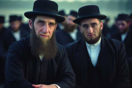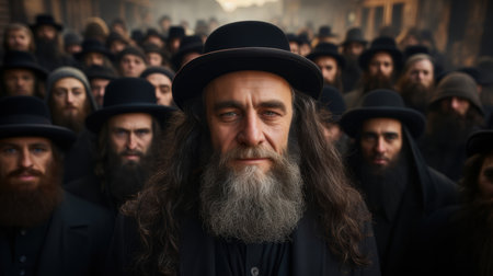 A significant gathering of Orthodox Hasidic Jews in traditional black attire, featuring men with long beards and distinct hats, displaying a sense of unity and cultural heritage.