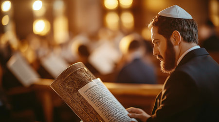 During Shabbat, an Orthodox Jewish man reads Torah in his synagogue AI Generative