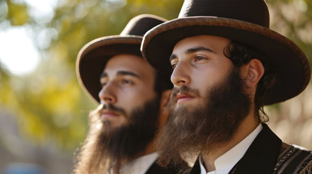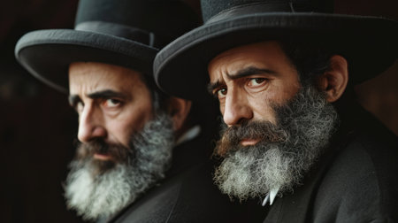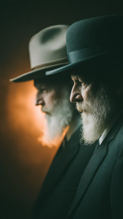 Two elderly men stand side by side their gray beards and wide brimmed hats framed against a warm background reflecting wisdom and friendship.