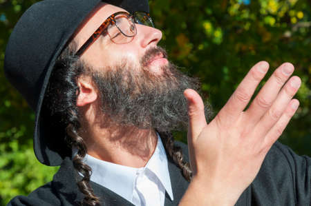 Outdoor sunny portrait of a young happy praying traditional orthodox Jewish man with eyeglasses and black beard, hat and costume