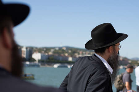 Hasids pilgrims in traditional clothes. Tallith - jewish prayer shawl. Uman, Ukraine - September 21, 2017: Rosh-ha-Shana festival, Jewish New Year.