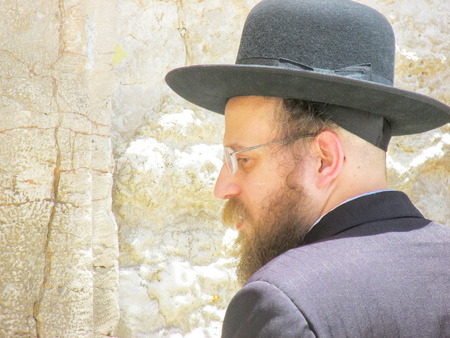 Jerusalem Israel June 19, 2019 View of unknown orthodox Israeli man praying at the Western wall in the Old city of Jerusalem in the afternoon