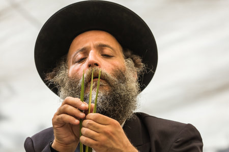 JERUSALEM, ISRAEL - SEPTEMBER 20, 2018: Religious Jew in a black hat and with a gray beard chooses a lulav. Sukkot Harvest holiday. The concept of religious, ethnographic and photo tourism