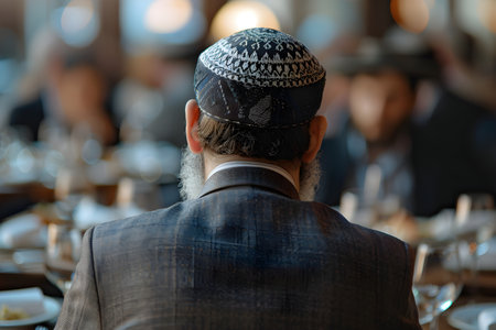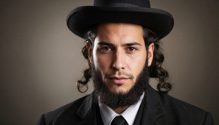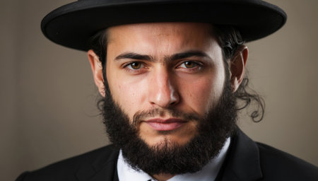 Portrait of a dignified Jewish man in traditional clothing, featuring a backdrop of Israel's flag. Captures a poignant, contemplative moment.
