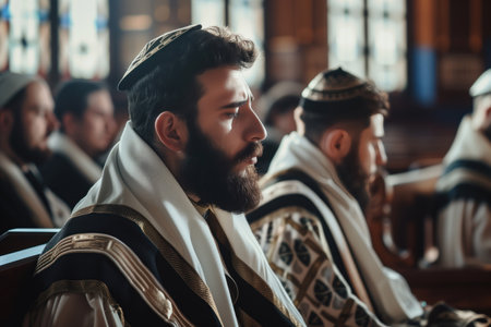 An orthodox Jewish congregation prays with tallit at a religious synagogue AI Generation