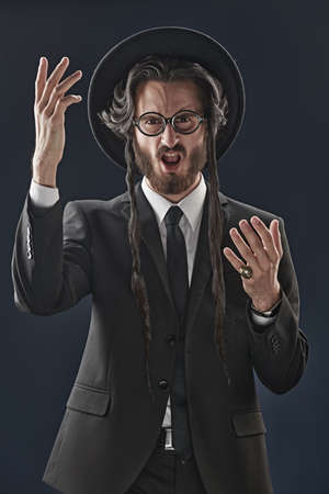 An Orthodox Jewish man raises his hands to heaven and speaks seriously and displeased about something. Studio shot on a dark blue background.