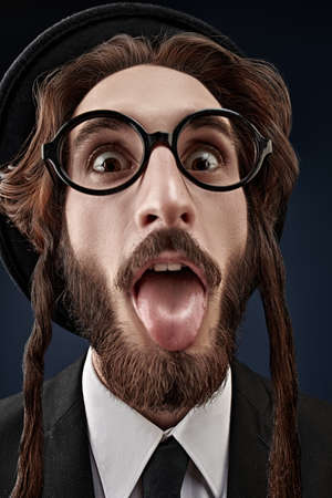 Portrait of a comical Orthodox Jewish shows his tongue. Studio shot on a dark blue background.