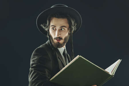 Orthodox Jewish man surprised, looking back holding opened talmud in his hands. Studio shot on a dark blue background.