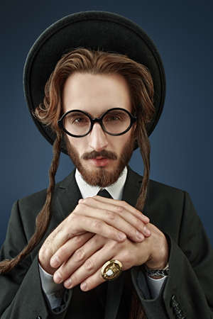 Portrait of a wealthy Jewish man with a gold ring on his finger looking at a camera. Rich Jew concept. Studio shot on a dark blue background.