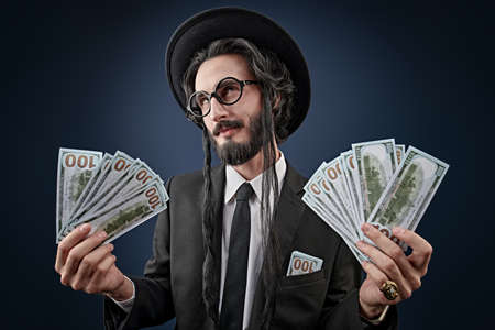Portrait of a wealthy Jewish man with bundles of banknotes. Rich Jew concept. Studio shot in a dark blue background.