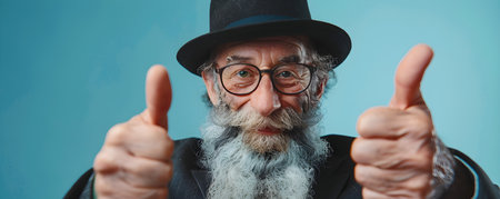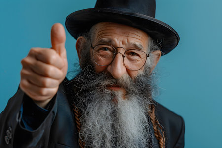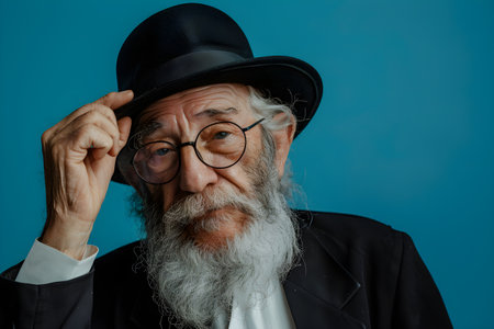 Portrait of senior orthodox jewish man wearing black hat on blue background. Jewish holiday