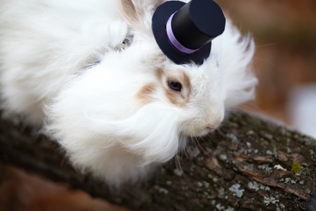 Stylish portrait of glamor dressed up bunny. Creative portrait of domestic animal on bright background.