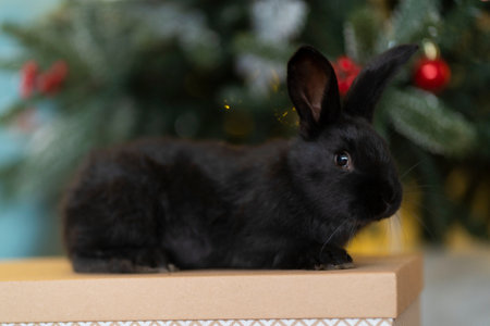 A black rabbit sits on a box against the backdrop of a Christmas tree