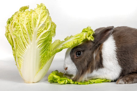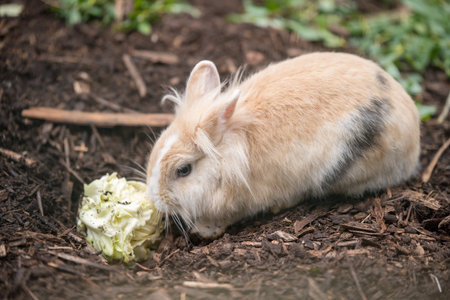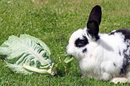 Cute rabbit is eating cabbage against a background of nature. Adorable little pets concept.
