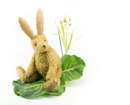 Cute toy bunny rabbit with long pointy ears sitting and looking over shoulder. On a white background with copy space.