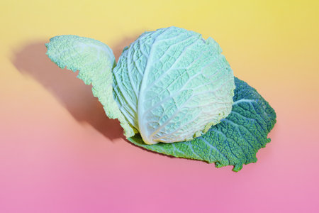 Fresh Savoy cabbage head on yellow and pink background. Copy space