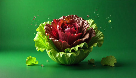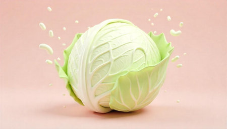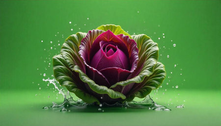 Stylized cabbage with surrounding liquid droplets, studio lighting