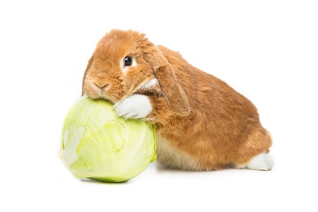 Adorable red domestic lop-eared rabbit with carrot and cabbage isolated over white background. Copy space.