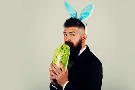 Easter bunny man eat cabbage hare. Healthy male on holiday. Happy business funny man. Vegan, vegeterian concept.